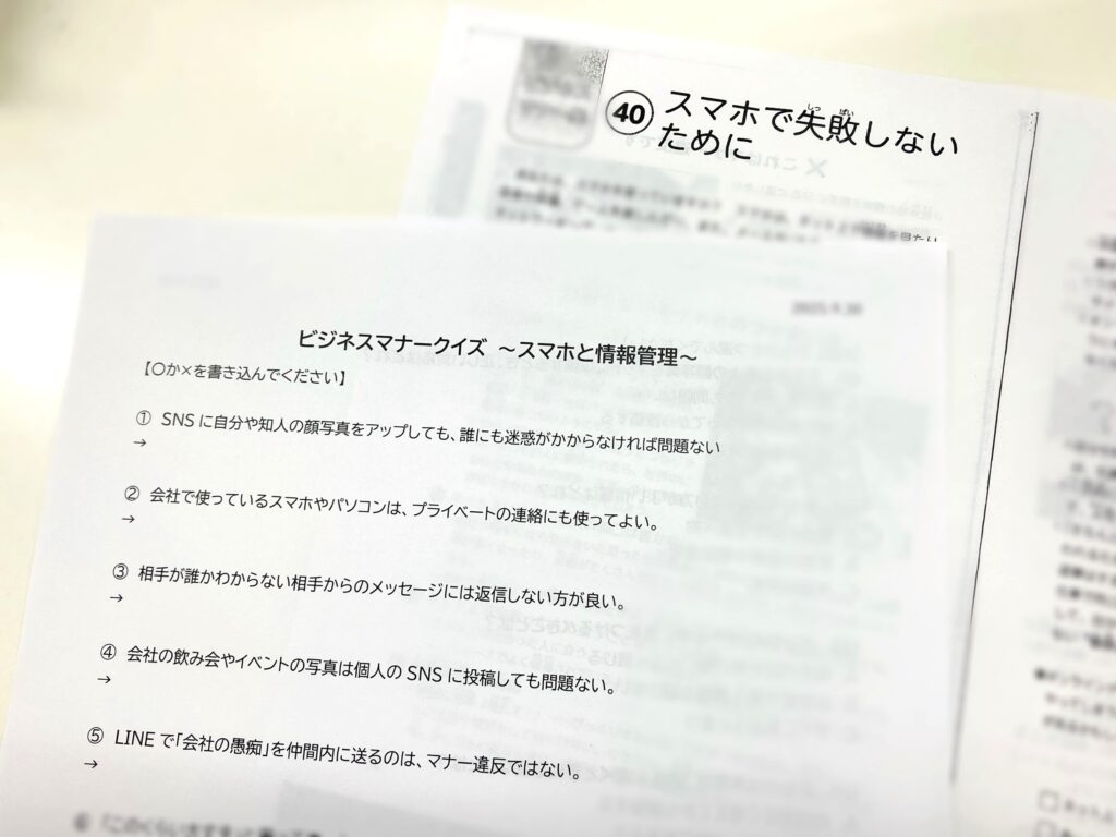 普段はちょっと堅苦しく感じるビジネスマナーですが、クイズにすると自然とリラックスできてとてもいい雰囲気で取り組めました🎵