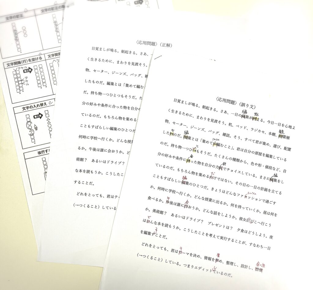 →校正記号の意味を理解し、表に従って使う練習になります。