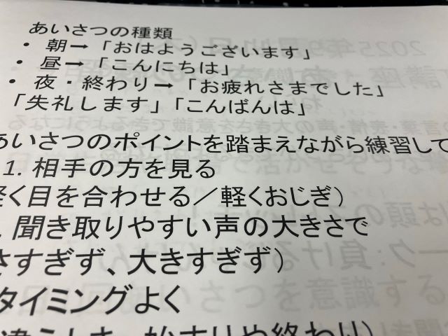 実際に声を出してもらい、いくつかの場面を想定してあいさつ練習を行いました。
