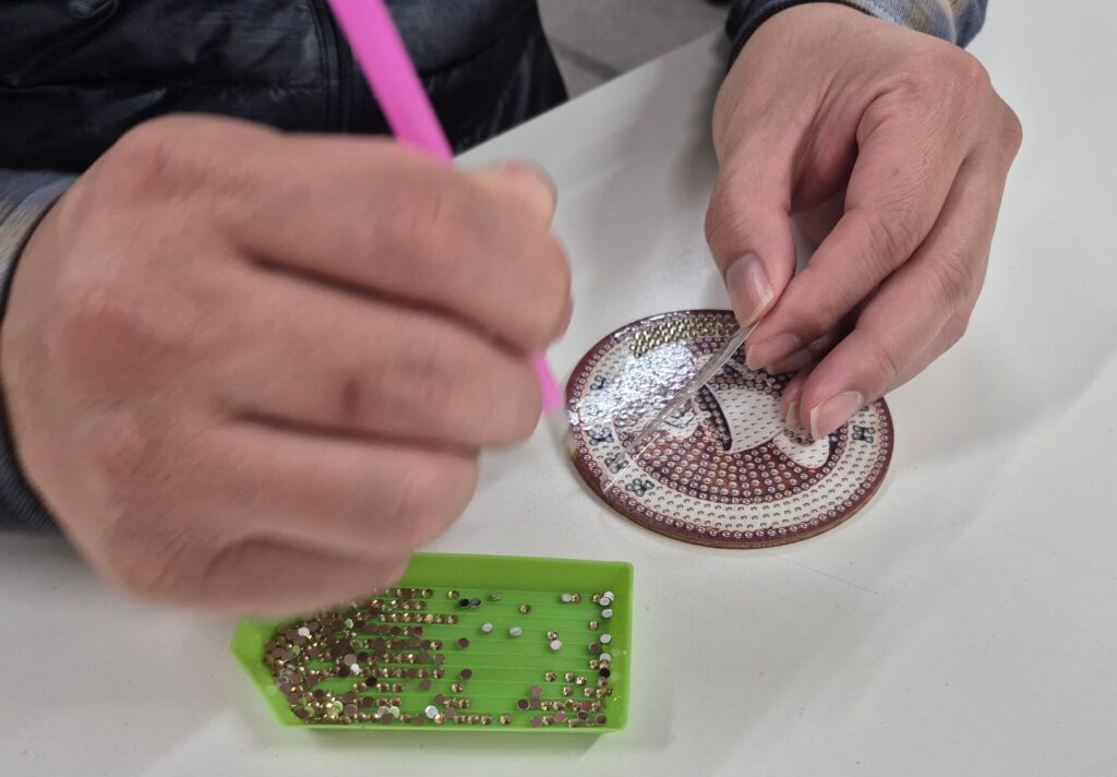 先日、事業所内ワークショップとしてダイヤモンドアートを使ったコースター作りを行いました。