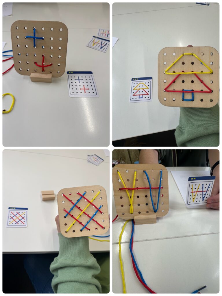 木製の穴あきボードとカラフルな紐、そして見本カードを使用しました。
