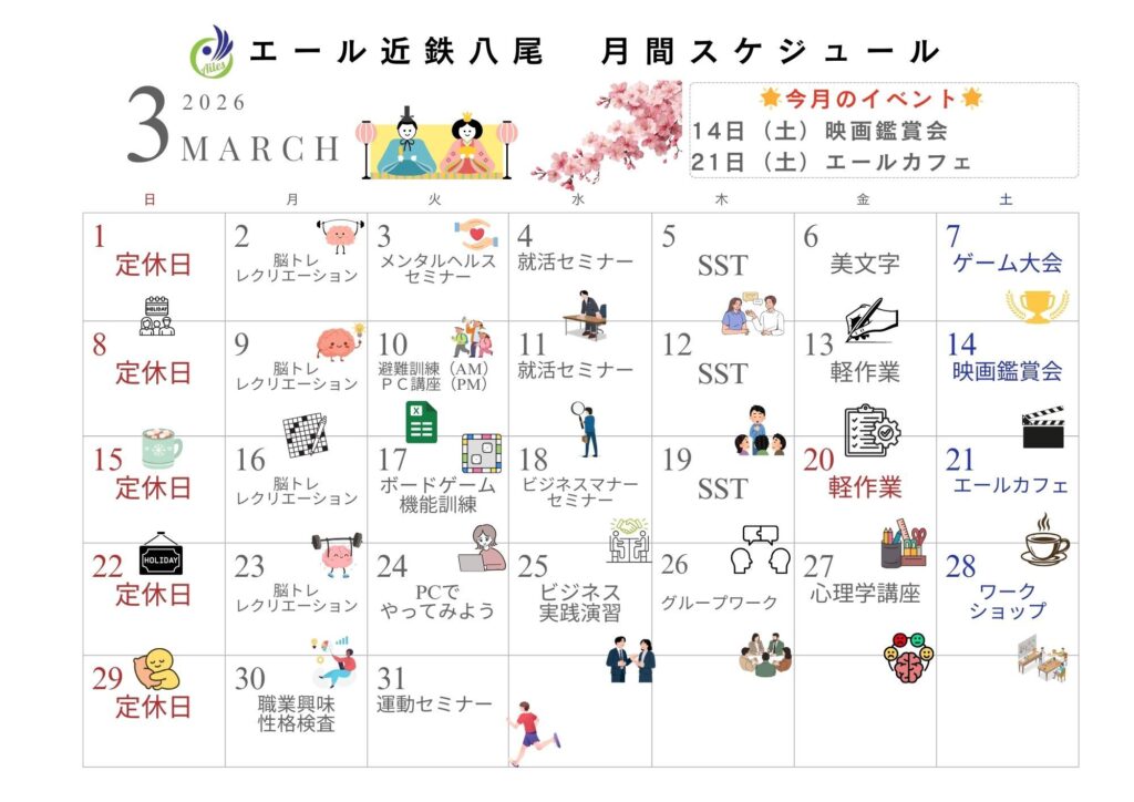 今月の当事業所のイベント・プログラムのスケジュール表です!