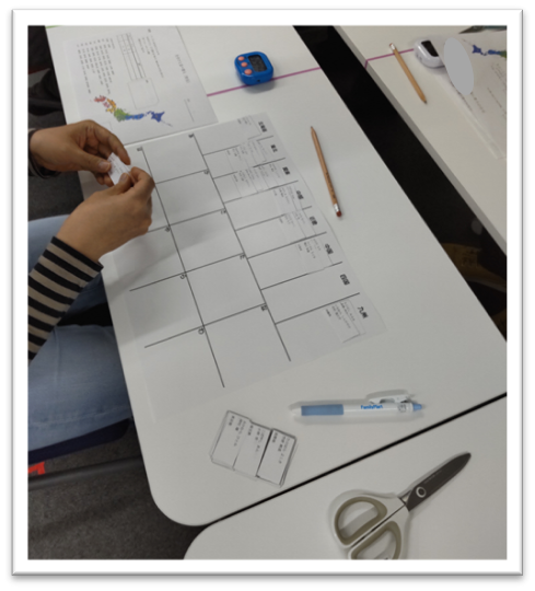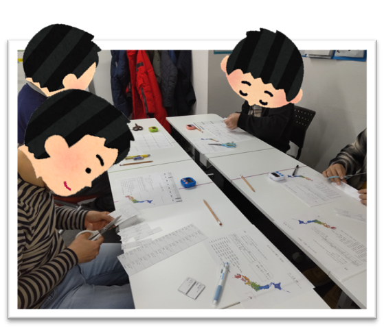切り終えたら、仕分け作業です。仕分けがしやすいように準備した用紙をお配りしました。前回はA4サイズでしたが、今回はA3サイズを使用していただきました。大きいサイズにすることで仕分けはスムーズに・・・その後の並べ替えにみなさん苦戦されていました。頭の中で「あ~い~う~え~お~・・・・」と繰り返し、途中で手が止まったりしながら・・・