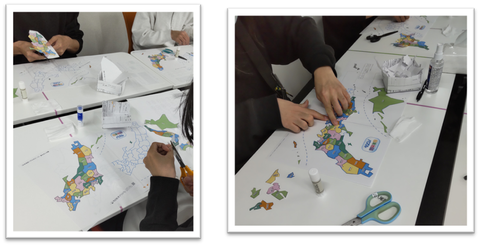 初めての方は、単純に切り貼りするだけでなく、「この県はここにあるのか~」など、勉強になりましたという感想をいただきました😃 時間内に完成することはできなかった方もいますが、回を重ねるごとに着実に早くなっていきますので、今後もまた「毎度おなじみの~」と言いながらも「日本地図パズル🗾」に取り組んでいただこうと思っています。
