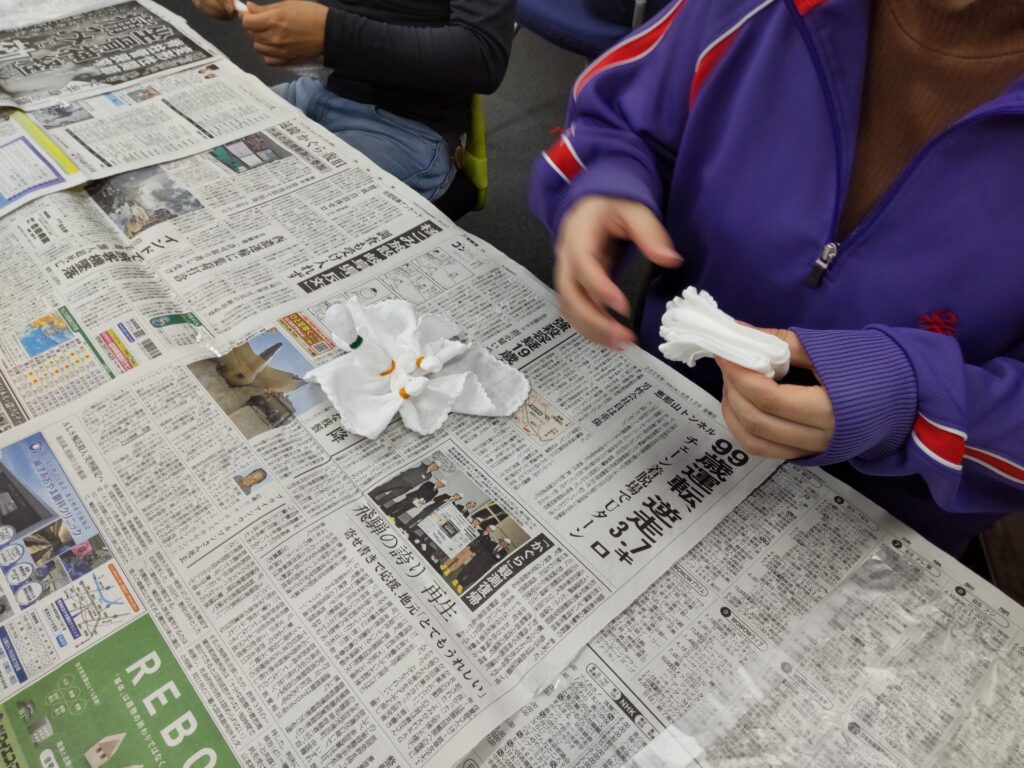 ハンカチを輪ゴムでしばったり、折りたたんだりして模様を作っていきます。