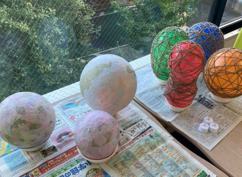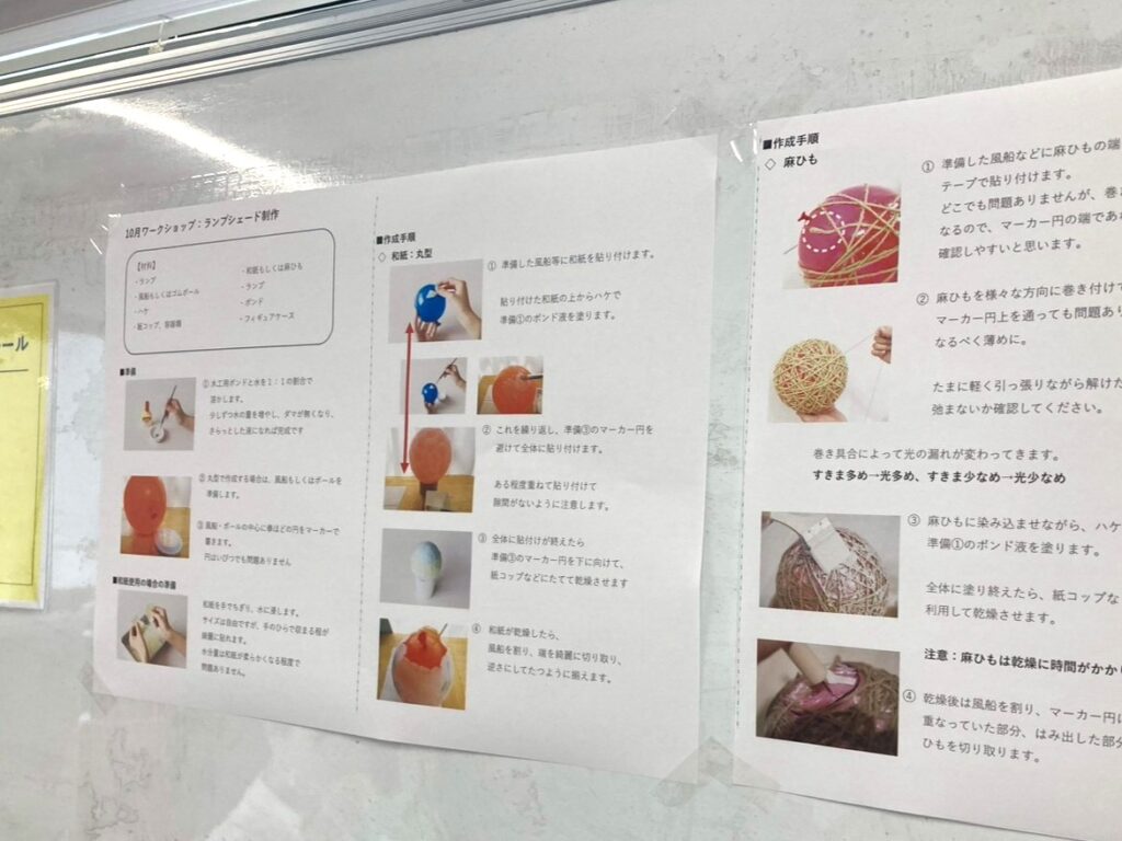 同日、スタッフが作成した大きめサイズのランプシェードも事業所入口の棚に展示しています