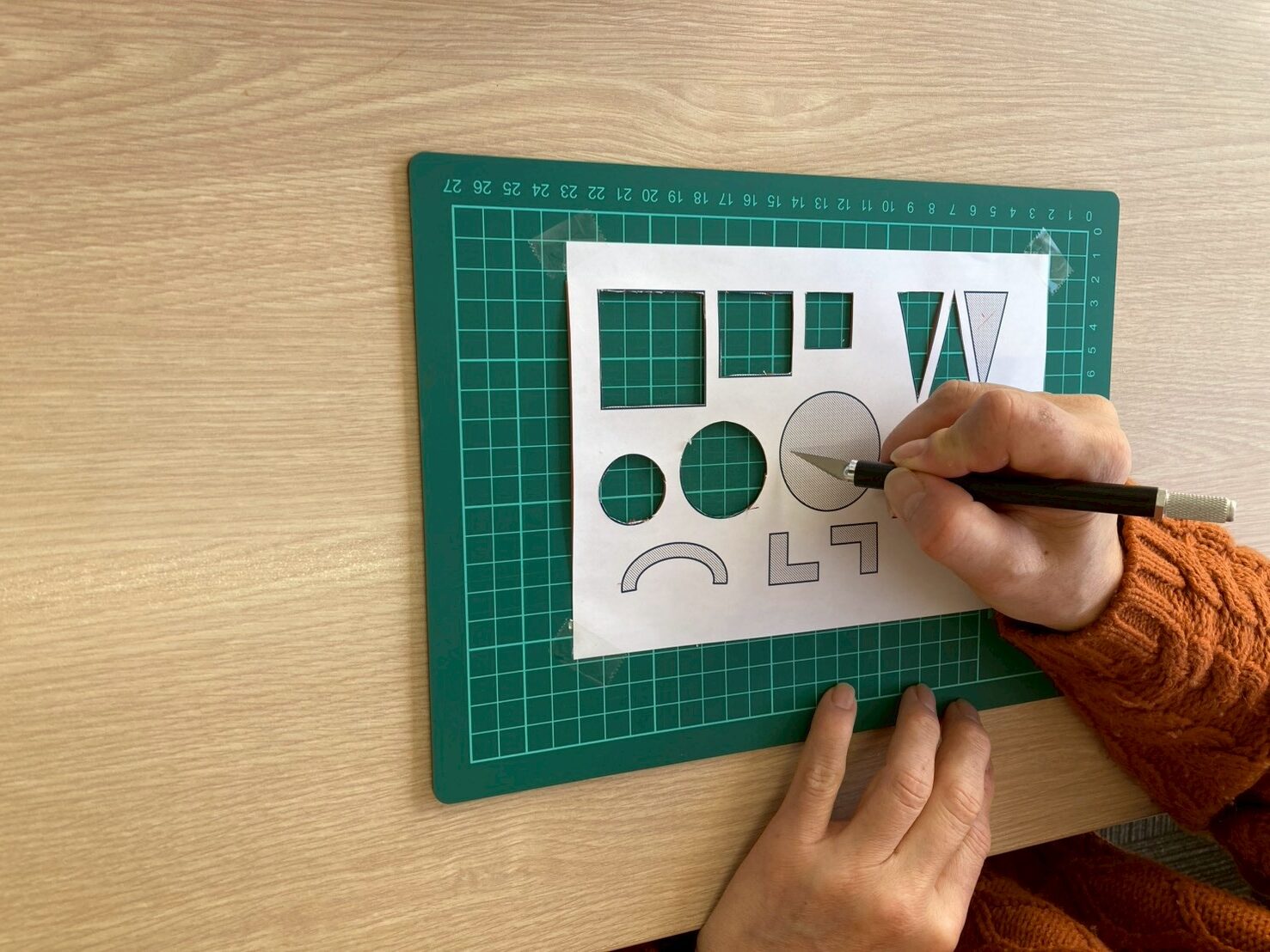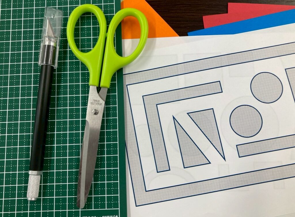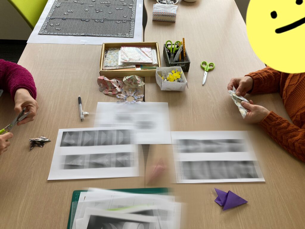 折り紙を一旦決まった手順で折りたたみ、型をペンで書いて切り取る作業です。