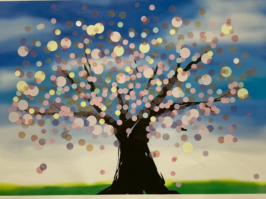 さて、今回のタイトルの通り、現在事業所では“通所利用で満開に”桜の丸シールアートを開催中🌸