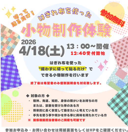 内容:はぎれ布を使った小物制作体験