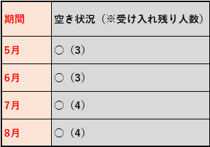 2026年4月21日現在の空き状況です。※受け入れ残り人数は開始時期によります。